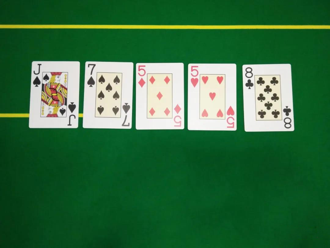 整个牌面为J♠7♠5 ♦ 5 ♥ 8♣。